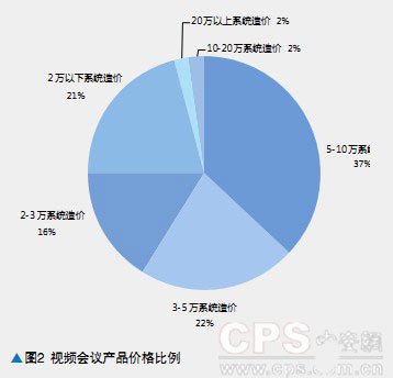 從產(chǎn)品價格上看,37%的視頻會議系統(tǒng)的每套價格在5-10萬之間,22%的視頻會議系統(tǒng)的每套價格在3-5萬元之間,另外,2-3萬/每套以及1-2萬/每套的視頻會議系統(tǒng)占據(jù)16%和21%。而價格在每套10萬以上的高端視頻會議系統(tǒng)占比不到5%。