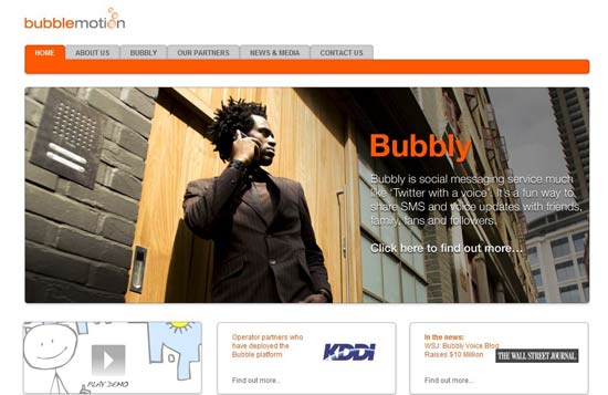 “Bubble Motion”的Bubbly平臺是一個(gè)手機(jī)端的語音微博服務(wù),允許用戶通過聲音向他們的關(guān)注者和粉絲發(fā)布狀態(tài)信息,模式與Twitter一樣,只是將文字變成了聲音,微博變成了bubbles,用戶將錄制的聲音更新到手機(jī),然后所有粉絲將收到一條短信通知,點(diǎn)擊短信內(nèi)的鏈接就可以收聽。