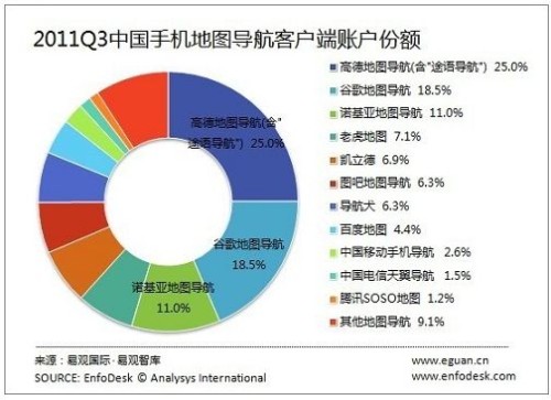 CTI論壇(ctiforum)11月3日消息(記者 潘婷婷): 綜合EnfoDesk易觀智庫產業(yè)數據庫《2011年第3季度中國手機地圖客戶端市場監(jiān)測報告》和《2011年第3季度中國手機導航客戶端市場監(jiān)測報告》數據,高德軟件、谷歌及諾基亞分別占據中國手機地圖導航客戶端用戶市場前三名的位置(中國"手機地圖客戶端+手機導航客戶端"的整體市場份額)。