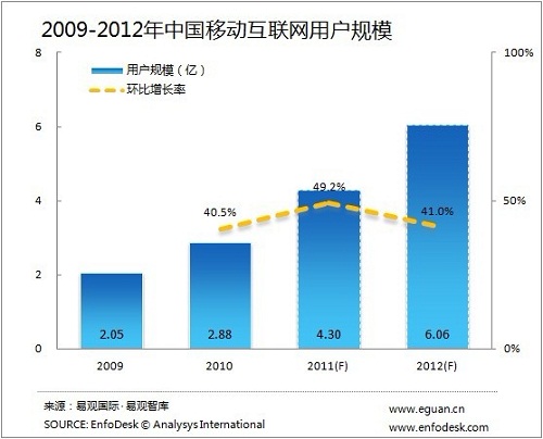 基于EnfoDesk易觀智庫(kù)對(duì)移動(dòng)互聯(lián)網(wǎng)的持續(xù)研究,預(yù)計(jì)2012年市場(chǎng)用戶規(guī)模及從移動(dòng)互聯(lián)網(wǎng)市場(chǎng)規(guī)模保持相對(duì)穩(wěn)定的增長(zhǎng),移動(dòng)互聯(lián)網(wǎng)用戶數(shù)有機(jī)會(huì)在2012年突破6億,并且超過(guò)互聯(lián)網(wǎng)用戶數(shù)量,智能終端、移動(dòng)互聯(lián)網(wǎng)應(yīng)用繼續(xù)延續(xù)2011年的增長(zhǎng)速度。