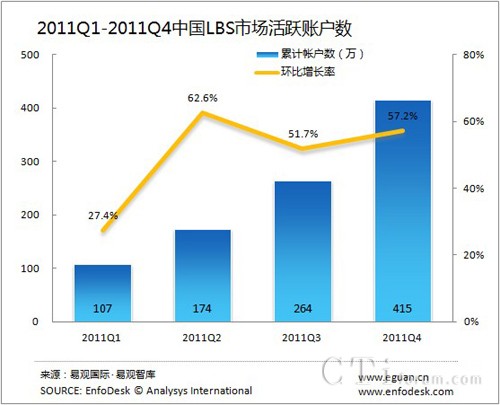 截止2011年12月底,中國移動(dòng)位置交友應(yīng)用(LBS)市場活躍賬戶規(guī)模達(dá)到415萬,環(huán)比增長率提升至57.2%。