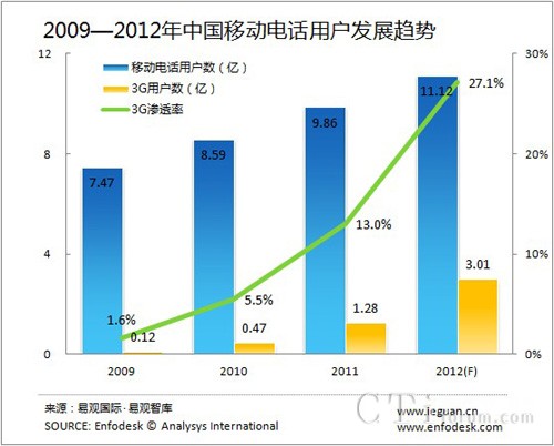 EnfoDesk易觀智庫分析認為,從手機普及程度的趨勢來看,移動電話用戶的增長將逐漸減緩,預(yù)計2012年將達11.1億。