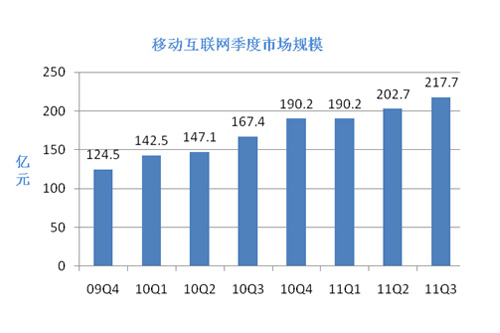 上圖是易觀國(guó)際發(fā)布的移動(dòng)互聯(lián)網(wǎng)的相關(guān)數(shù)據(jù),數(shù)據(jù)截止到2011年第三季度,該圖顯示,2009年全球經(jīng)濟(jì)復(fù)蘇之后,移動(dòng)互聯(lián)網(wǎng)業(yè)務(wù)收入一直保持著良好的增長(zhǎng)狀態(tài),最新數(shù)據(jù)表明,2011年移動(dòng)互聯(lián)網(wǎng)的整體市場(chǎng)規(guī)模已達(dá)到851億,遠(yuǎn)超過(guò)2010年的637億,增長(zhǎng)率將近33.6%,在移動(dòng)互聯(lián)網(wǎng)業(yè)務(wù)子領(lǐng)域中,表現(xiàn)最突出的是移動(dòng)電子商務(wù),與2009年相比較,移動(dòng)電子商務(wù)所占比例由3%直線增長(zhǎng)到11%。但是在手機(jī)閱讀和手機(jī)游戲方面則表現(xiàn)平平,有較大的增長(zhǎng)空間。預(yù)計(jì)2012年3G用戶規(guī)模將增長(zhǎng)到6億,將會(huì)超過(guò)互聯(lián)網(wǎng)用戶數(shù)量,智能機(jī)以及移動(dòng)互聯(lián)網(wǎng)還會(huì)保持或者超過(guò)2011年的增長(zhǎng)速率。