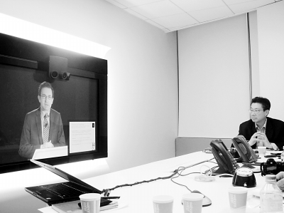 圖:Orange網(wǎng)絡(luò)解決方案業(yè)務(wù)部副總裁Nicolas Roy在巴黎演講,Orange中國區(qū)首席技術(shù)官劉昕(右)在主持北京視頻會(huì)議現(xiàn)場