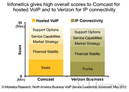 - Comcast公司在托管VoIP服務方面獲得33分的高分,滿分是35分;West公司、Verizon公司和8x8公司也位列北美頂級托管VoIP服務提供商。