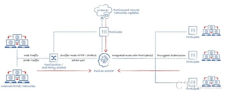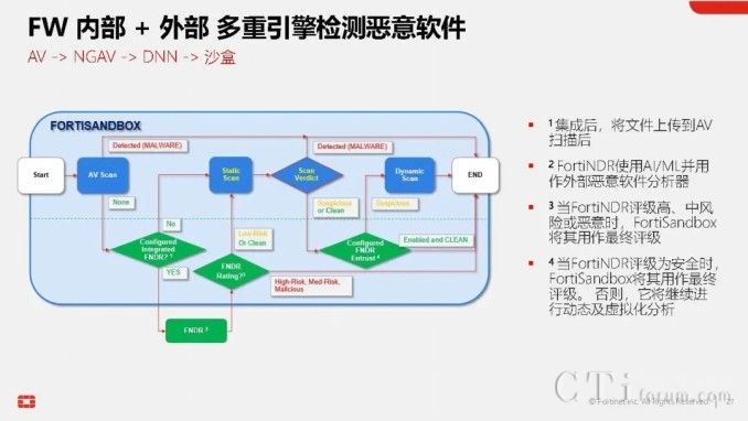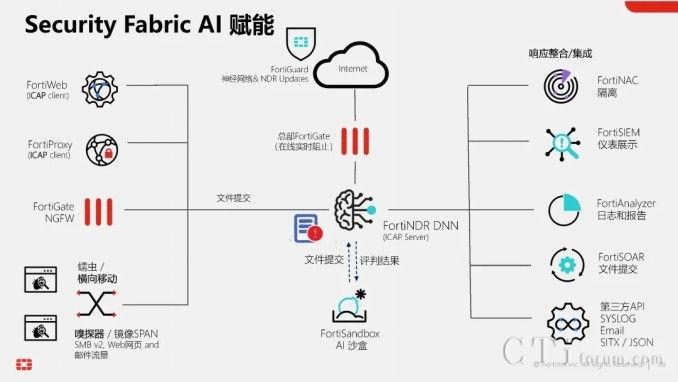 此外,AI技術(shù)還貫穿于Fortinet的多個(gè)產(chǎn)品與功能中,形成高效的工作流。以威脅檢測與響應(yīng)為例,當(dāng)FortiGate的雙引擎也無法確定某個(gè)文件的合法性時(shí),它可以將該文件提交給FortiNDR進(jìn)行深度分析,利用云端深度神經(jīng)網(wǎng)絡(luò)AI進(jìn)行0 Day攻擊、勒索軟件等深層次分析。若仍無法確定,還可進(jìn)一步提交給FortiSandbox,在虛擬機(jī)環(huán)境中進(jìn)行模擬操作,進(jìn)行更為深入的檢測。在這一系列流程與技術(shù)的支持下,F(xiàn)ortinet的威脅檢測與響應(yīng)能力已達(dá)到業(yè)界頂尖水平,向滿分100分邁進(jìn)。