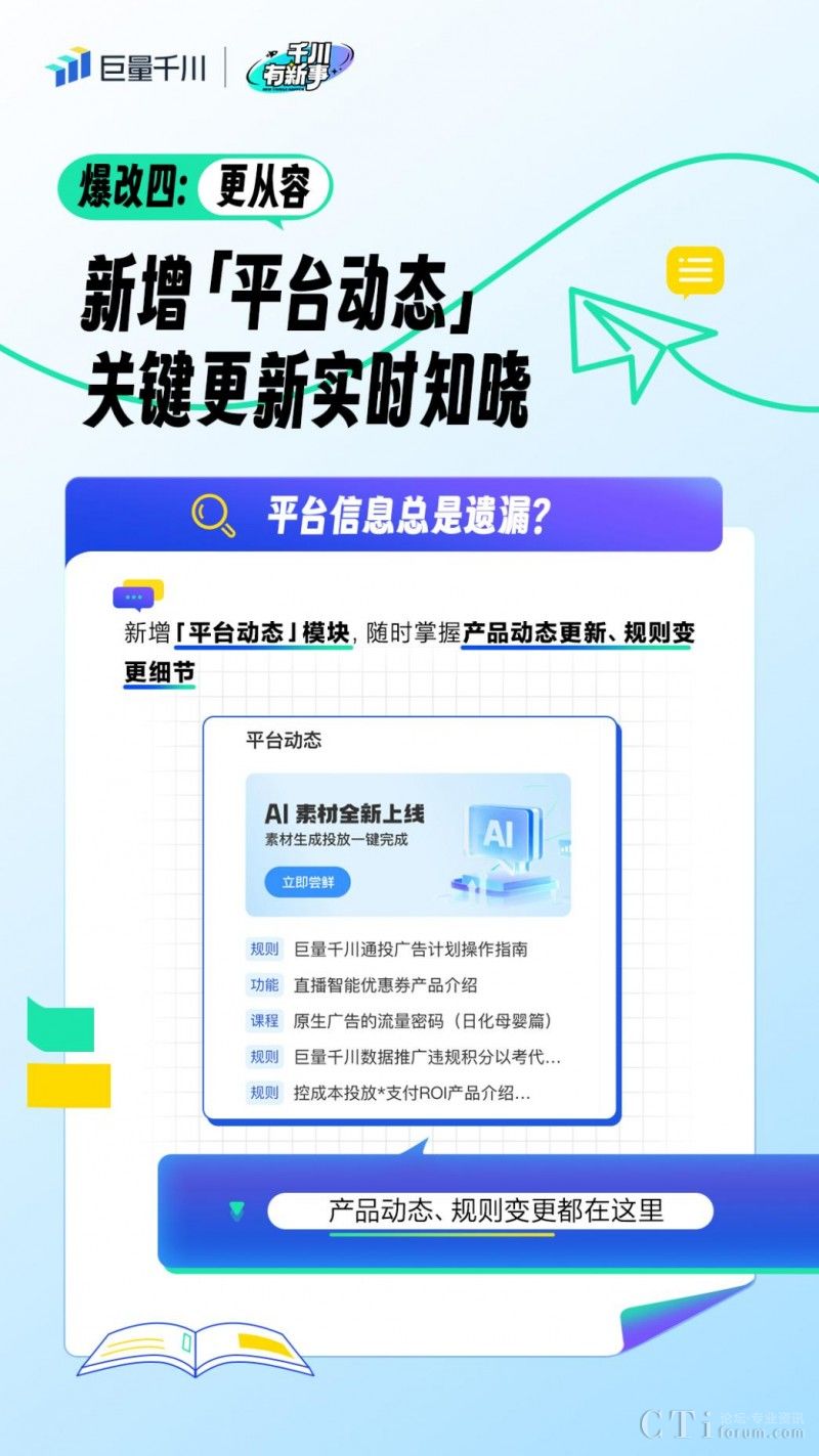 巨量千川首頁升級還增設(shè)了「平臺動態(tài)」模塊,實時呈現(xiàn)平臺產(chǎn)品更新、規(guī)則變更等信息,讓商家可以及時了解平臺最新動態(tài),把握生意增長機(jī)遇。