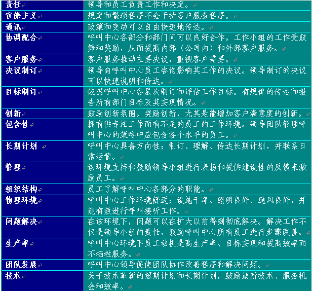 附錄6提供了建議的員工滿意度調(diào)查表。可以作為準(zhǔn)備制訂呼叫中心使用的版本的起點。在制訂表格時,應(yīng)從所有中心最佳實踐工作和領(lǐng)導(dǎo)團(tuán)隊確認(rèn)的其他部門取得評估要素。表格6總結(jié)了呼叫中心員工滿意度調(diào)查應(yīng)包含的主要方面: