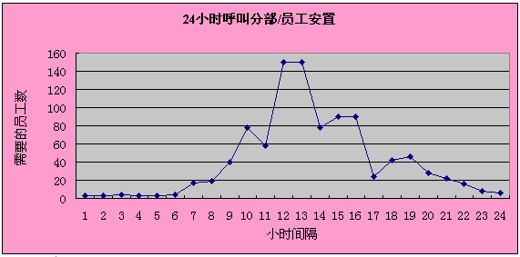 呼叫中心一年中要運行365天,也就是說每天需要三次8小時工作替換。一天中員工需求量會隨著呼叫量高峰期和低估期而波動。下面的圖標(biāo)詳細(xì)說明了平時可能需要的變化的員工需求。