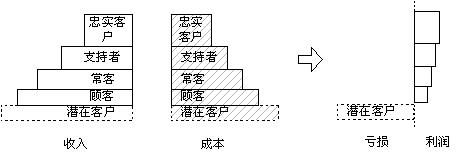 科特勒根據(jù)客戶的忠誠度給了我們一個階梯,這是客戶關系管理工作的良好參照,同時也可作為客戶關系管理工作考核的工具。我們將這個階梯做如下改造:每個層次的寬度是此級次客戶的數(shù)量,每個層次的高度是此級次客戶給企業(yè)帶來的收入,我們可以得到一個企業(yè)收入客戶分布結(jié)構圖,如右圖所示: 從圖中可以很清楚的看出客戶管理工作的內(nèi)容:層次寬度(每個層次客戶的數(shù)量)和層次的高度(每個層次客戶的平均贏利水平)。 |