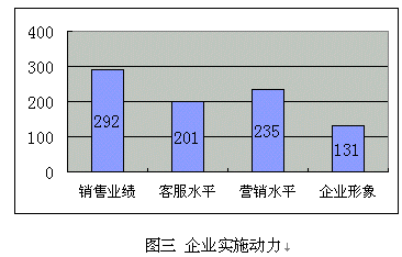 (d)提升企業(yè)形象:很多受訪企業(yè)特別是服務(wù)業(yè),已經(jīng)建立客戶忠誠(chéng)度放在了很重要的位置,但比較其它幾個(gè)直接動(dòng)因,比例偏低,這也似乎說(shuō)明"以客戶為中心"的觀念還沒(méi)有"以利潤(rùn)為中心"強(qiáng)烈。