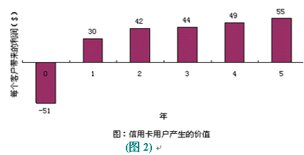 以信用卡服務(wù)為例,爭(zhēng)取一個(gè)新的用戶平均要51美圓,用于廣告、推銷(xiāo)和開(kāi)戶等開(kāi)支。用戶開(kāi)始時(shí)花錢(qián)很少,但為公司帶來(lái)一定的利潤(rùn)。但如果用戶繼續(xù)使用到第二年,就會(huì)為公司帶來(lái)更多的經(jīng)濟(jì)效益,因?yàn)楣九c客戶之間的信任和客戶對(duì)公司的滿意,致使客戶更多地通過(guò)信用卡消費(fèi)。(圖:"信用卡用戶產(chǎn)生的價(jià)值")用戶貢獻(xiàn)在增加,公司的運(yùn)作費(fèi)用卻在不斷減低。信用卡公司可以不斷減少對(duì)客戶信用的審核時(shí)間。保持長(zhǎng)期的客戶關(guān)系,還可以減少?gòu)V告支出,客戶本身就是一個(gè)免費(fèi)的廣告資源。很多人在消費(fèi)前喜歡聽(tīng)取朋友的意見(jiàn),覺(jué)得比廣告更可信。