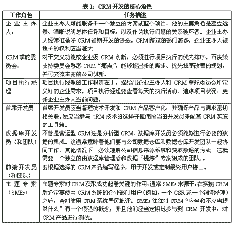 表1列出了CRM開發(fā)團隊中的核心工作功能。在開始著手一個開發(fā)項目之前,確保已經(jīng)考慮了下面的每一種角色;并且從公司內(nèi)部和外部來理解勝任這些角色所必需的技能。