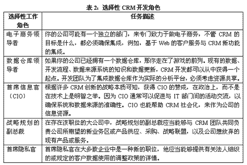 根據(jù)你的CRM項目的廣泛性和復雜性,對于在表2中列出的工作角色,你可以有選擇地在CRM開發(fā)中添加。