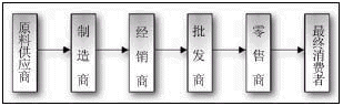 在社會化大生產的前提下,任何商品被制造和被消費的過程,實際上是在多個環(huán)節(jié)、多個商家進行“傳遞”的過程,這一過程構成的“通道”就是“供應鏈”。供應鏈的研究就是從分銷模式開始的。在分銷模式下,最常見的價值傳遞的通道如下圖所示: