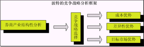 上圖為利用哈佛著名教授邁克爾o波特的競爭戰(zhàn)略分析框架來分析證券營業(yè)部的競爭戰(zhàn)略。由于此文的著眼點是以證券營業(yè)部為中心的產(chǎn)業(yè),也就是證券公司的經(jīng)紀業(yè)務產(chǎn)業(yè),而證券公司的其他金融服務項目如投資、自營等業(yè)務不在本文討論的范疇。