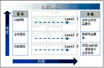 從全球CRM最佳實踐來看,企業(yè)實施CRM不外乎CRM軟件功能驅(qū)動、業(yè)務驅(qū)動和客戶關(guān)系戰(zhàn)略驅(qū)動三種情況。所以,實施CRM的視點也有三種,如下圖所示:一是,從CRM產(chǎn)品功能角度,根據(jù)產(chǎn)品所能提供的功能,選擇自己需要實施的CRM內(nèi)容。這種視點充其量只能夠讓企業(yè)擁有部分CRM的功能,有限地提高部分業(yè)務處理的效率。二是,從業(yè)務角度出發(fā),通過局部優(yōu)化業(yè)務流程,實施CRM。在項目中所涉及的業(yè)務流程可能要貫穿多個CRM功能模塊。這種視點解決了一部分業(yè)務問題,它主要以流程效益或部門效益最優(yōu)為目標。三是,從企業(yè)CRM戰(zhàn)略角度出發(fā),從總體、全局、發(fā)展的高度規(guī)劃和實施CRM。CRM戰(zhàn)略驅(qū)動視點不僅追求局部效益最優(yōu),而且能夠?qū)崿F(xiàn)企業(yè)總體業(yè)務效益的最大化。雖然,企業(yè)可以根據(jù)自身客戶關(guān)系管理的實際情況選擇CRM視點的高度,但是在絕大多數(shù)企業(yè)的實踐中,都會選擇CRM戰(zhàn)略高度作為著眼點,規(guī)劃企業(yè)客戶關(guān)系管理。