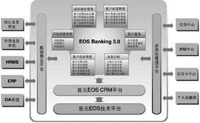 普元公司順應(yīng)中國(guó)銀行業(yè)發(fā)展的趨勢(shì),綜合國(guó)內(nèi)外金融業(yè)的市場(chǎng)營(yíng)銷和管理模型,把具有世界級(jí)水平的EOS平臺(tái)推廣到銀行業(yè),提供具有中國(guó)特色的“EOS銀行客戶經(jīng)理管理系統(tǒng)”。這套系統(tǒng)可以幫助銀行快速組織資源,面向客戶提升客戶服務(wù)、市場(chǎng)營(yíng)銷水平,同時(shí)對(duì)客戶經(jīng)理的業(yè)績(jī)考核加強(qiáng)管理,為客戶經(jīng)理提供風(fēng)險(xiǎn)控制工具,為營(yíng)銷主管部門決策提供支持。最終實(shí)現(xiàn)幫助銀行達(dá)到提高利潤(rùn)、降低成本,提高銀行客戶滿意度及提高市場(chǎng)占有率的管理目標(biāo)。