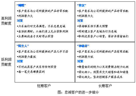 CRM廠商和業(yè)界普遍認為:只要贏得了客戶的忠誠,企業(yè)將"財源滾滾";因此企業(yè)在培養(yǎng)客戶忠誠方面的開支在逐步上升。因為從表面上看來,客戶滿意度、客戶忠誠度和客戶保留度越高,客戶利潤貢獻度就大。但事實并不如他們所愿,《哈佛商業(yè)評論》最新的論文,研究表明:客戶滿意度、客戶忠誠度與客戶利潤貢獻度的關(guān)聯(lián)程度比預(yù)期的要小得多。企業(yè)應(yīng)當對忠誠客戶再進行細分,然后在更細化的客戶基礎(chǔ)上對其進行分類管理,并采取相應(yīng)的對策。在論文中,作者根據(jù)利潤貢獻度大小與客戶的短長期兩個維度,將忠誠客戶進行了深層次細分。主要分成四類:"蝴蝶"、"摯友"、"陌生人"、"神秘者"。企業(yè)應(yīng)該根據(jù)每一類的情況采取相應(yīng)的對策。管理那些能使企業(yè)盈利但不忠誠的客戶--"蝴蝶"--的關(guān)鍵是,在他們購物時盡可能地從他們身上獲利。對那些既能帶來利潤又忠誠的客戶--"摯友",細心呵護他們則更為恰當。至于那些忠誠但不能帶來利潤的客戶--"藤壺",你需要做的是確定他們是否有增加消費的潛力。最后,對于"陌生人"--那些既不忠誠又沒有利潤可賺的客戶,答案當然很簡單:早點認出他們,不對他們做任何投資。