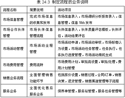 根據(jù)CRM軟件的總體目標,項目組詳細審核每個業(yè)務的流程,并按照流程對軟件進行定制。所制定的流程包括三大業(yè)務領域的業(yè)務,見表24.3。