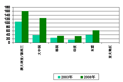 亞太區(qū)(日本除外)的CRM應(yīng)用市場中,澳大利亞繼續(xù)處于主導(dǎo)地位,2003年市場規(guī)模為9,740萬美元,據(jù)IDC預(yù)測,2008年有望增至1.452億美元,未來五年的年復(fù)合增長率將達到8%。中國以2,580萬美元的CRM應(yīng)用市場收入居其次,且IDC預(yù)測,2008年的市場收入將達1.086億美元,未來五年的年復(fù)合增長率為33%。此外,中國金融、電信等服務(wù)行業(yè)的市場化,迫使這些行業(yè)為了保持競爭能力而增強CRM技術(shù)的應(yīng)用,這是CRM應(yīng)用在金融和電信行業(yè)的普及、從而帶動中國CRM應(yīng)用市場迅猛增長的原因。另外,進駐中國的外資企業(yè)在CRM方面的投入也帶動了需求的增長。亞太區(qū)(日本除外)第三大CRM應(yīng)用市場是韓國,2003年市場收入約為2,500萬美元,2008年有望增至3,390萬美元,未來五年的年復(fù)合增長率6%。
