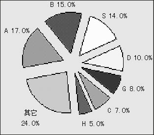 圖2 2003年中國××軟件市場品牌市場結(jié)構(gòu)(假設)