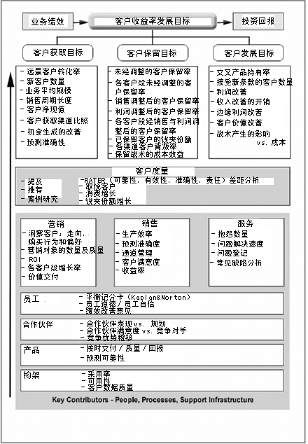 Buttle 教授所著《中端市場CRM》一書中發(fā)現(xiàn)的。它們按縱向排列,最頭上是客戶收益率及發(fā)展目標。下面是對其進行支持的度量方法,此外還提供了一些關(guān)鍵指標用以指示策略是否起作用或需要調(diào)整。當然我知道你能投入更多,不過我建議你專注于那些能夠直接影響到CRM遠景與策略的度量方法。如果你發(fā)現(xiàn)以前的度量方式成了障礙,那么就把它們清除掉。
