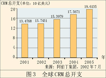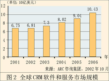 單單這還不是惟一能夠說明問題的。早在2002年,F(xiàn)orrester研究公司就聲稱,來自CRM的收入將從428億美元增長到738億美元。AMR研究公司同樣預(yù)測,這個領(lǐng)域會不斷增長。AMR的調(diào)查表明,91%的公司會在這方面增加開支,預(yù)計總開支會增長8%。值得一提的是,AMR所指的這一塊市場是“客戶管理”,而不是較為傳統(tǒng)的CRM,這說明CRM應(yīng)用軟件的作用發(fā)生了轉(zhuǎn)變。