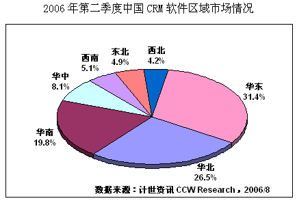 2006年二季度國內(nèi)CRM軟件的區(qū)域市場中,華東,華北,華南是CRM軟件的主要市場,共占據(jù)了CRM軟件區(qū)域市場中77.7%的市場份額,依次為:華東占31.4%,華北占26.5%,華南占19.8%。