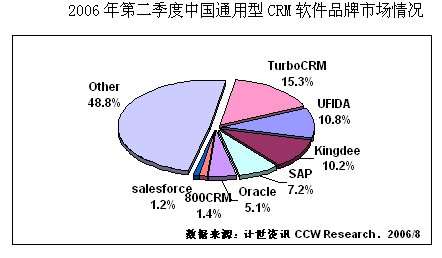 2006年二季度中國通用型CRM軟件廠商市場格局中, TurboCRM、UFIDA(用友)、Kingdee (金蝶),位居市場前3名,市場份額依次為:15.3%,10.8%,10.2%。