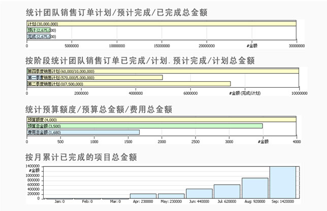 在VamCRM項(xiàng)目組合管理中集成項(xiàng)目數(shù)據(jù)的統(tǒng)計(jì)與分析,可以直接監(jiān)控項(xiàng)目計(jì)劃、預(yù)計(jì)及完成的項(xiàng)目數(shù)量、總金額和費(fèi)用的統(tǒng)計(jì),也可按月累計(jì)已完成的項(xiàng)目數(shù)量、總金額和費(fèi)用,直接衡量項(xiàng)目實(shí)施的結(jié)果與效益。在費(fèi)用管理模塊中集成費(fèi)用數(shù)據(jù)的統(tǒng)計(jì)與分析,對于所有費(fèi)用可以按人及費(fèi)用類型進(jìn)行統(tǒng)計(jì),實(shí)時(shí)知道哪一個(gè)人或哪一類費(fèi)用開銷最多,以及費(fèi)用與預(yù)算的對比分析。