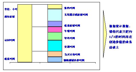銷售資源是有限的,如何合理分配資源并確保最大的客戶機(jī)會(huì)和客戶價(jià)值是一個(gè)關(guān)鍵的問(wèn)題。對(duì)于銷售代表,個(gè)人的時(shí)間是寶貴的資源。根據(jù)統(tǒng)計(jì)數(shù)據(jù),銷售人員只把約1/3的時(shí)間用于增值的業(yè)務(wù)洽談上,這意味著在銷售人員的時(shí)間管理上有很大的提升空間。如圖3-1所示。