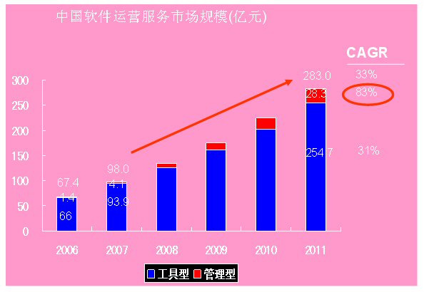 2006中國(guó)軟件運(yùn)營(yíng)服務(wù)(SaaS)產(chǎn)業(yè)的規(guī)模為68億元,2011年將突破400億,達(dá)到406億元,未來(lái)五年的復(fù)合增長(zhǎng)率達(dá)到43%。這是國(guó)內(nèi)ICT領(lǐng)域權(quán)威研究機(jī)構(gòu)計(jì)世資訊(CCW Research)在其最新發(fā)布的《軟件業(yè)的下一個(gè)十年——中國(guó)軟件運(yùn)營(yíng)服務(wù)(SaaS)市場(chǎng)發(fā)展趨勢(shì)研究報(bào)告》中指出的。