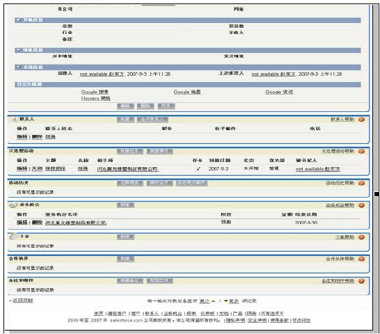Salesforce作為國際最著名的在線CRM廠商,其軟件的操作性表現(xiàn)得過于平淡,缺乏連貫性。在保存客戶信息、添加聯(lián)系人的過程中,用戶需要在客戶信息、聯(lián)系人信息界面切換。界面的往復(fù)刷新大大降低了用戶體驗(yàn),操作性只能用穩(wěn)定來形容?旖菪陆ǖ淖侄芜^少,實(shí)際應(yīng)用不算很方便。