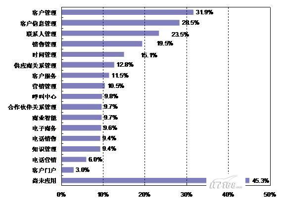 。。調查顯示,2007年有45.3%的企業(yè)還未應用CRM信息化系統(tǒng)。在已經(jīng)應用該系統(tǒng)的企業(yè)中,CRM系統(tǒng)應用主要就是客戶管理,占到31.9%;其次是客戶信息管理和聯(lián)系人管理,這些應用比例集中在23~31%之間;其他應用還有銷售管理(19.5%)、時間管理(15.1%)、供應商關系管理(12.8%)、客戶服務(11.5%)和營銷管理(10.5%)等,呼叫中心、合作伙伴關系管理、商業(yè)智能、電子商務、電話銷售、知識管理、電話營銷等比例均在10%以下。