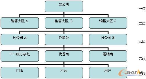 目前國(guó)內(nèi)企業(yè)分銷(xiāo)網(wǎng)絡(luò)層次最多可達(dá)到五層,如圖1所示。最上層是營(yíng)銷(xiāo)總部,第二層是銷(xiāo)售大區(qū),第三層是各地分公司、辦事處,第四層是各地辦事處、代理商和經(jīng)銷(xiāo)商,第五層是用戶(hù)或門(mén)店。