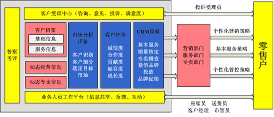 客戶管理:建立客戶全面檔案信息,提供客戶觀察器,對零售客戶的基本信息、網(wǎng)建信息、銷售信息、專賣信息等進(jìn)行360度分析查詢;對零售客戶進(jìn)行評價與分類,為差異化服務(wù)和“一對一營銷”提供依據(jù)。