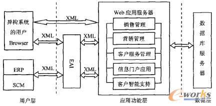 包括ERP、SCM等其他企業(yè)應(yīng)用在內(nèi)的所有的系統(tǒng)用戶與應(yīng)用功能層的數(shù)據(jù)交換均通過(guò)XMI數(shù)據(jù)進(jìn)行傳輸,從而大大減小了各種企業(yè)應(yīng)用系統(tǒng)間的通信阻力,為EAI提供了良好的通信平臺(tái)。Web用戶的客戶端只是“瘦小的”瀏覽器日_數(shù)量不受限制,不需要安裝專門(mén)的軟件,這使得凡可以接入Internet的用戶都可以方便、靈活地使用系統(tǒng),大大提升了系統(tǒng)用戶間溝通、協(xié)作的效率。此外,由于CRM應(yīng)用系統(tǒng)是在中央服務(wù)器上實(shí)施和維護(hù)的,對(duì)客戶端的要求遠(yuǎn)沒(méi)有C/S結(jié)構(gòu)那么高,集中的軟件實(shí)施和維護(hù)大大節(jié)約了企業(yè)的運(yùn)行成本和維護(hù)費(fèi)用。圖1描述的是筆者所要闡述的適應(yīng)網(wǎng)絡(luò)環(huán)境的基于Web的系統(tǒng)平臺(tái)架構(gòu),這并不意味著CRM應(yīng)用系統(tǒng)完全以這種方式運(yùn)行,事實(shí)上用戶接入CRM系統(tǒng)的方式是多種多樣的,系統(tǒng)還應(yīng)該提供電話、傳真、無(wú)線接入等多種接入接口。