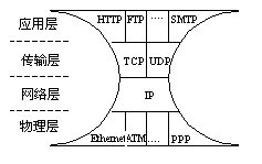 。。IP協(xié)議在多樣的物理介質(zhì)與多樣的應(yīng)用需求之間建立了簡單而統(tǒng)一的映射方法。這樣形成的融合網(wǎng)絡(luò)具有沙漏型的體系結(jié)構(gòu),如圖2所示,可以靈活地進(jìn)行業(yè)務(wù)的配置和物理網(wǎng)絡(luò)的升級。由于IP技術(shù)在安全性和用戶管理方面的缺陷在三網(wǎng)融合過程當(dāng)中還不構(gòu)成大的障礙,因此基于IP進(jìn)行三網(wǎng)融合幾乎是必然的選擇。