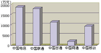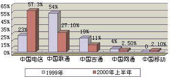 通過引入IP電話業(yè)務(wù),我國電信市場(chǎng)已經(jīng)形成了以中國電信、中國聯(lián)通、中國移動(dòng)、中國吉通和中國網(wǎng)通等五大電信運(yùn)營公司為主體的新格局。他們各自的業(yè)務(wù)范圍不盡相同,但I(xiàn)P電話是他們相同的業(yè)務(wù)之一,所以這一市場(chǎng)相互之間的競(jìng)爭(zhēng)較為激烈。圖1和圖2分別表示這五大運(yùn)營商在2000年上半年IP電話的話務(wù)量和收入。從圖中可以看出,他們?cè)谖覈鳬P電話市場(chǎng)上所占據(jù)的地位和角色。