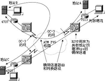 這個例子中,OC-3 ATM連接配置上3 Mbps PVCsL連到不同的遠(yuǎn)程位置。RSVP確保QOS從這個PVC通過當(dāng)?shù)氐木W(wǎng)絡(luò)路由連到正確的使用地。