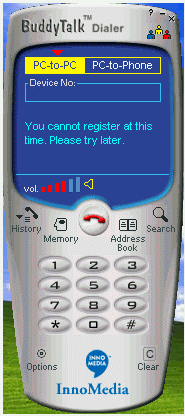 (如圖3),這個就是BuddyTalk的軟件界面。這象不象一個手機?上面的藍(lán)色部分是液晶屏。你可以選擇pc-to-pc或者pc-to-phone,下面是用來輸入電話號碼的一個空框,空框下面的部分是軟件顯示提示信息的,再下面是音量大小的顯示器。液晶屏的下面部分跟手機幾乎一樣,其中一個“search”,這是用來上網(wǎng)實現(xiàn)全球用戶數(shù)據(jù)庫搜索,一個“options”,各種設(shè)置可以在這里完成,“Memory”記錄的是你通話信息,以利快速撥號。