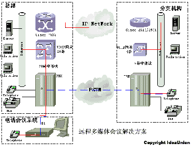 圖中紅色實(shí)線表示通過IP網(wǎng)絡(luò)傳輸語音的線路,藍(lán)色虛線表示通過PSTN傳輸語音的線路。由于通過IP網(wǎng)絡(luò)沒有使用額外的長(zhǎng)途線路,所以降低了遠(yuǎn)程會(huì)議系統(tǒng)的運(yùn)行成本。同時(shí)VoIP傳輸系統(tǒng)支持普通的長(zhǎng)途電話呼叫,為客戶節(jié)省長(zhǎng)途電話開支。