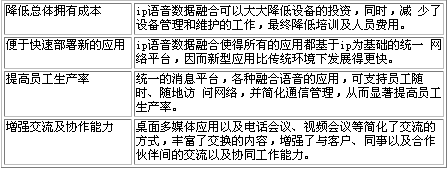 人們常常認(rèn)為語音數(shù)據(jù)融合帶來的明顯優(yōu)勢(shì)只是成本下降,其實(shí),事實(shí)遠(yuǎn)不止如此,語音、視頻、數(shù)據(jù)統(tǒng)一傳輸?shù)男录夹g(shù)必然帶來許多新的網(wǎng)絡(luò)應(yīng)用和解決方案。這些創(chuàng)新的多媒體解決方案可以開發(fā)成供應(yīng)鏈管理、電子商務(wù)、客戶服務(wù)、生產(chǎn)效率、電子教學(xué)當(dāng)中的應(yīng)用,幫助企業(yè)將傳統(tǒng)業(yè)務(wù)處理和國際互聯(lián)網(wǎng)結(jié)合起來,形成一種嶄新的經(jīng)濟(jì)模式。其作用是將信息流遍布整個(gè)企業(yè)的銷售、研發(fā)、管理、服務(wù)等各個(gè)流程。對(duì)內(nèi)加快信息流通,加強(qiáng)員工、生產(chǎn)的管理,提高運(yùn)作效率。對(duì)外提供優(yōu)良的客戶服務(wù),統(tǒng)一供應(yīng)鏈,從而在競(jìng)爭(zhēng)中脫穎而出。