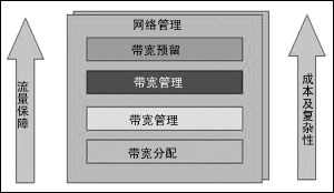 如圖所示,網(wǎng)絡(luò)管理貫穿于四個(gè)模塊建立過程中。特定的組件應(yīng)針對(duì)網(wǎng)絡(luò)基礎(chǔ)設(shè)施的特定部分而實(shí)施。具體實(shí)施時(shí),應(yīng)首先從帶寬分配模塊開始,然后逐個(gè)上移。實(shí)施的模塊越多,保證的品質(zhì)會(huì)越高,但同時(shí)也增加了管理的復(fù)雜性,加大了維護(hù)成本。