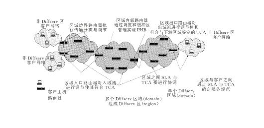 區(qū)分服務(wù)是由綜合服務(wù)(Int-serv )發(fā)展而來的,它采用了IETF的基于RSVP的服務(wù)分類標(biāo)準(zhǔn),拋棄了分組流沿路節(jié)點(diǎn)上的資源預(yù)留。區(qū)分服務(wù)將會(huì)有效地取代跨越大范圍的RSVP的使用。區(qū)分服務(wù)區(qū)域的主要成員有:核心路由器、邊緣路由器、資源控制器(BB,Bandwidth Broker)。在區(qū)分服務(wù)中,網(wǎng)絡(luò)的邊緣設(shè)備對(duì)每個(gè)分組進(jìn)行分類、標(biāo)記DS域,用DS域來攜帶IP分組對(duì)服務(wù)的需求信息。在網(wǎng)絡(luò)的核心節(jié)點(diǎn)上,路由器根據(jù)分組頭上的DS碼點(diǎn)(Code Point)選擇碼點(diǎn)所對(duì)應(yīng)的轉(zhuǎn)發(fā)處理。資源控制器BB配置了管理規(guī)則,為客戶分配資源,它可以通過服務(wù)級(jí)別協(xié)定SLA (Service Level Agreement)與客戶進(jìn)行相互協(xié)調(diào)以分享規(guī)定的帶寬。