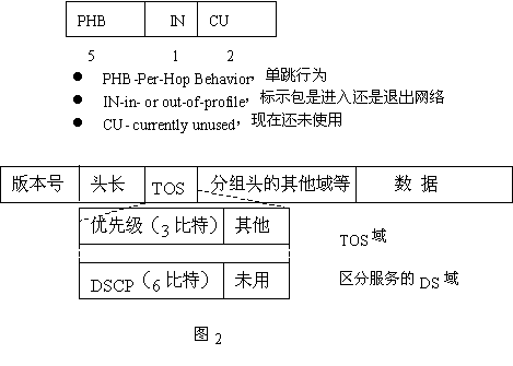 QoS的業(yè)務(wù)區(qū)分結(jié)構(gòu)使用IPV4報(bào)頭中的業(yè)務(wù)類型(TOS)字段,并將8位TOS字段重新命名,作為DS字段,其中6位可供目前使用,其余2位以備將來使用。該字段可以按照預(yù)先確定好的規(guī)則加以定義,使下行節(jié)點(diǎn)通過識(shí)別這個(gè)字段,獲取足夠的信息來處理到達(dá)輸入端口的數(shù)據(jù)包并將他們正確地轉(zhuǎn)發(fā)給下一跳的路由器。這里需要注意的是在IPV4網(wǎng)中所定義的TOS字段與在Diff-Serv中的DS字段不同。TOS字段的定義如圖2所示。圖IPV4報(bào)頭中TOS字段定義Diff-Serv充分考慮了IP網(wǎng)絡(luò)本身靈活,可擴(kuò)展性強(qiáng)的特點(diǎn),將復(fù)雜的服務(wù)質(zhì)量保證通過DS字段轉(zhuǎn)換為先進(jìn)的單跳行為,從而大大減少了信令的工作。