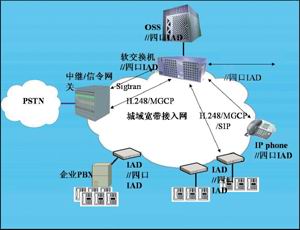 本地軟交換通過中繼/信令網(wǎng)關與PSTN互通,用戶接入終端形式通常有IAD(集成接入設備)和IP phone。IAD提供普通電話POTS接口,容量從單門到幾百門。IAD根據(jù)容量可以放置在用戶室內、樓道或專用機房里。IP