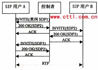 控制者向A發(fā)送re-INVITE,包含SDP3作為offer。假設(shè)用戶A不想改變原來的會話屬性,在200 OK響應(yīng)中包含的應(yīng)答應(yīng)該仍是SDP2?刂普甙l(fā)送ACK之后,就可以有媒體從A流向B。