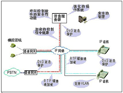 IP電話的各個(gè)組成部分從語音服務(wù)器、語音網(wǎng)關(guān)到IP電話都能夠?qū)oS攻擊具有相應(yīng)的保護(hù)功能: